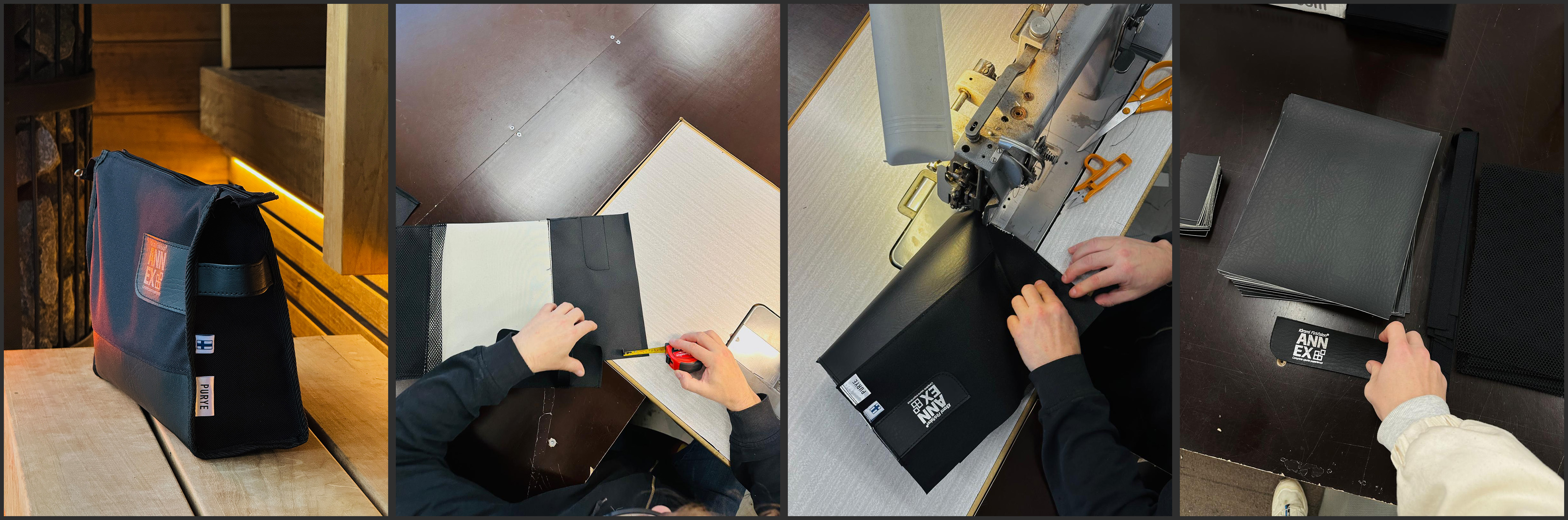 We deliver modular saunas worldwide, and to ensure our products arrive intact, we pack them carefully. Around the sauna modules, we build a wooden frame for protection against impacts. Over this frame, we attach a black fabric cover to shield the shipment from rain and debris. When cutting the fabric for our saunacovers, we end up with leftover pieces measuring 48x48 cm from each corner. Together with PURYE, we found a new purpose for the leftover pieces.