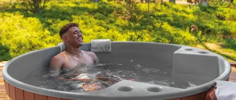 The hot tub is heated with a shapely external grey Macu heater, suitable for heating medium-sized tubs. It is made out of high-quality marine-grade aluminium.