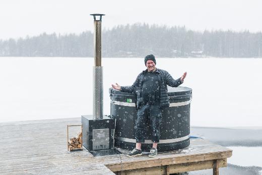 The hot tub is heated with a shapely external grey Macu heater, suitable for heating medium-sized tubs. It is made out of high-quality marine-grade aluminium.
